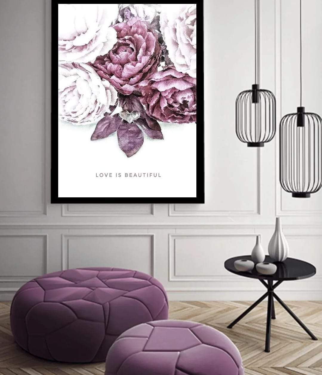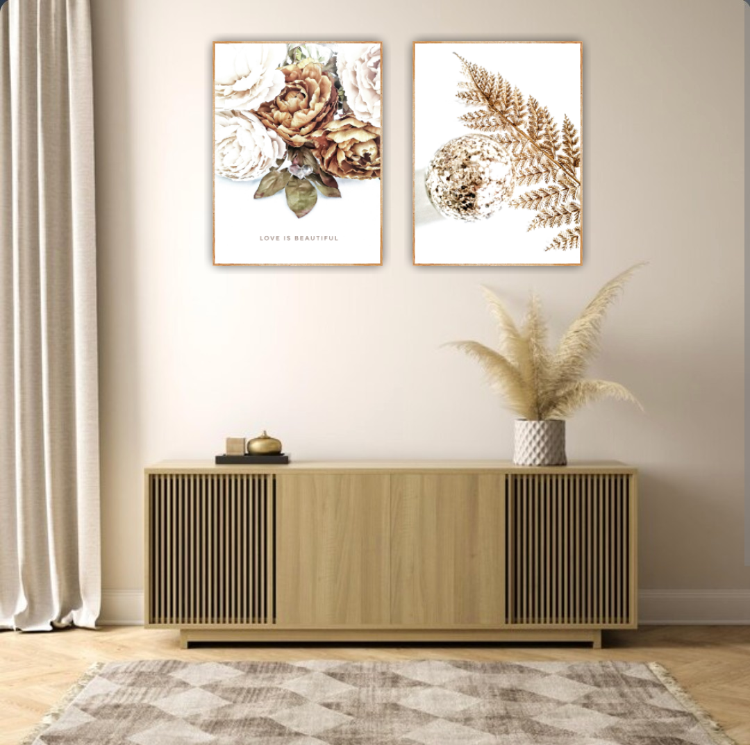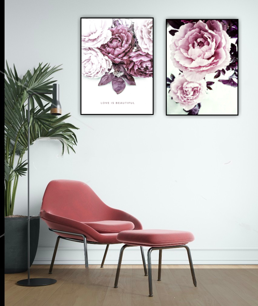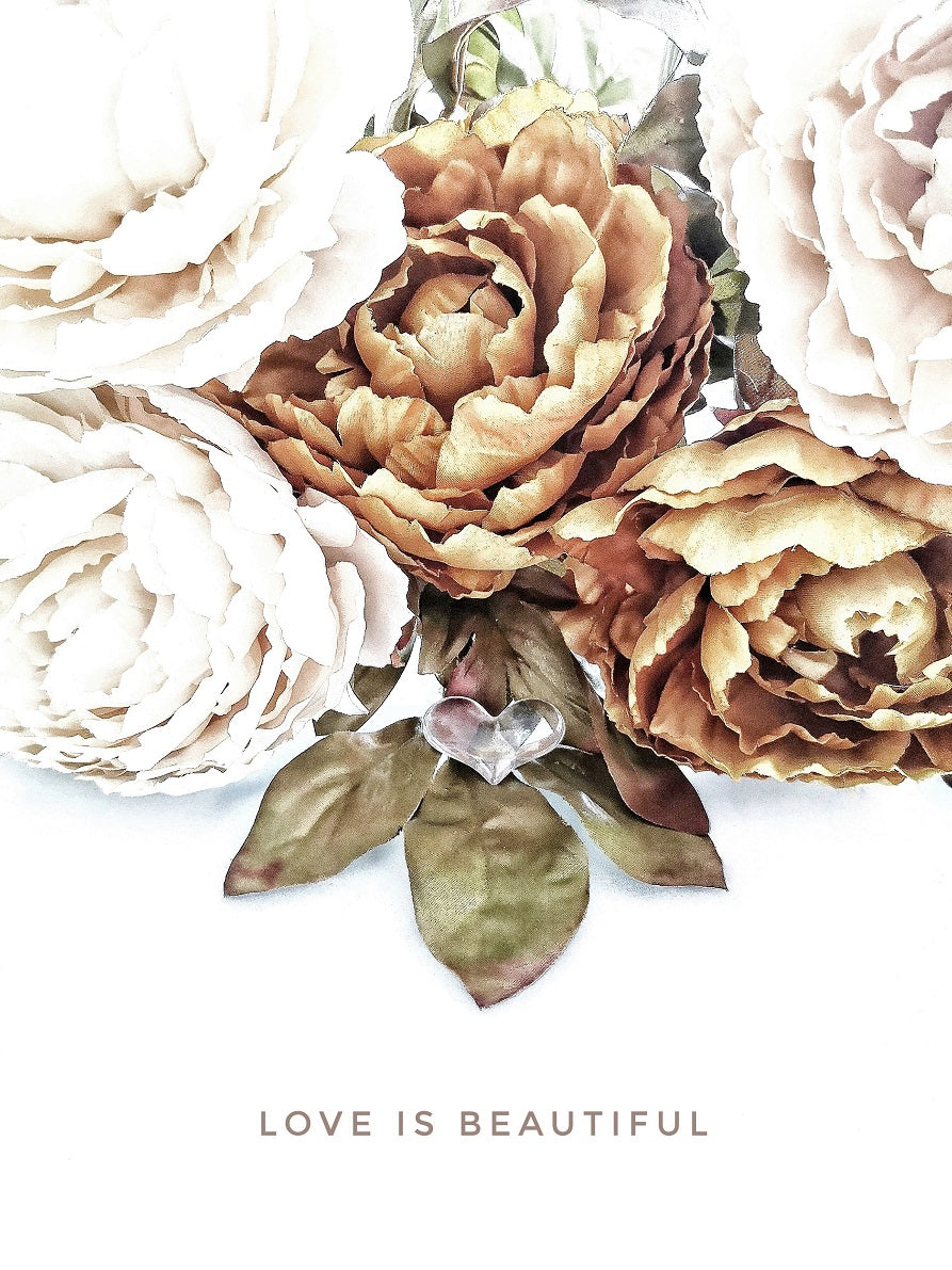 Ett vackert botaniskt motiv med vackra pioner och ett symboliskt hjärta med texten "Love is Beautiful". En romantisk poster som ger en varm o inbjudande känsla. Kombinera den gärna tillsammans med andra motiv i samma färgtoner för en fint och harmoniskt intryck. Se miljöbilder för inspiration.