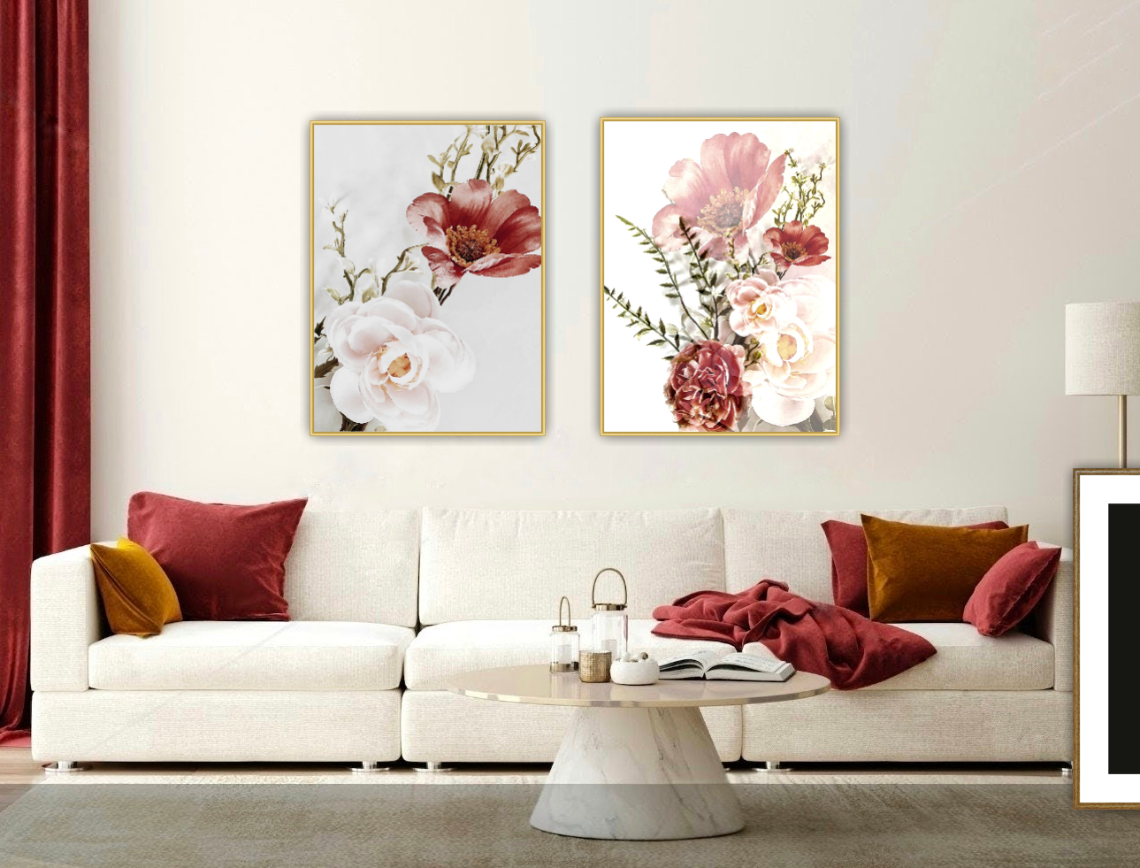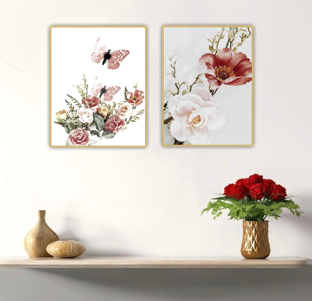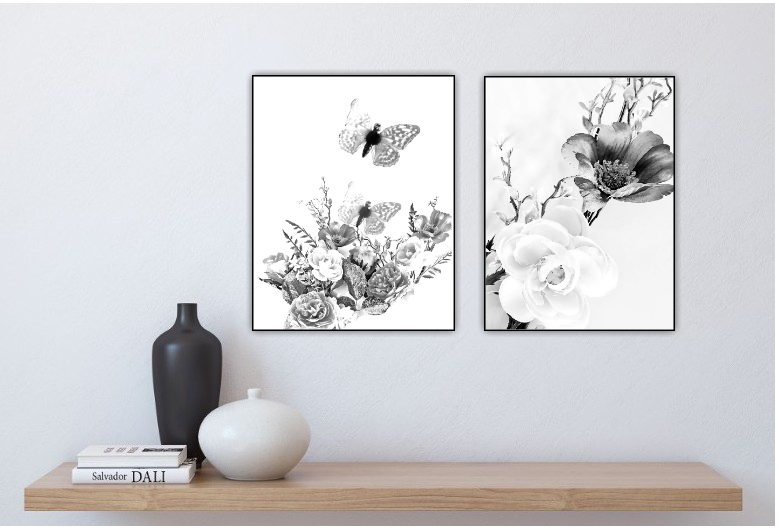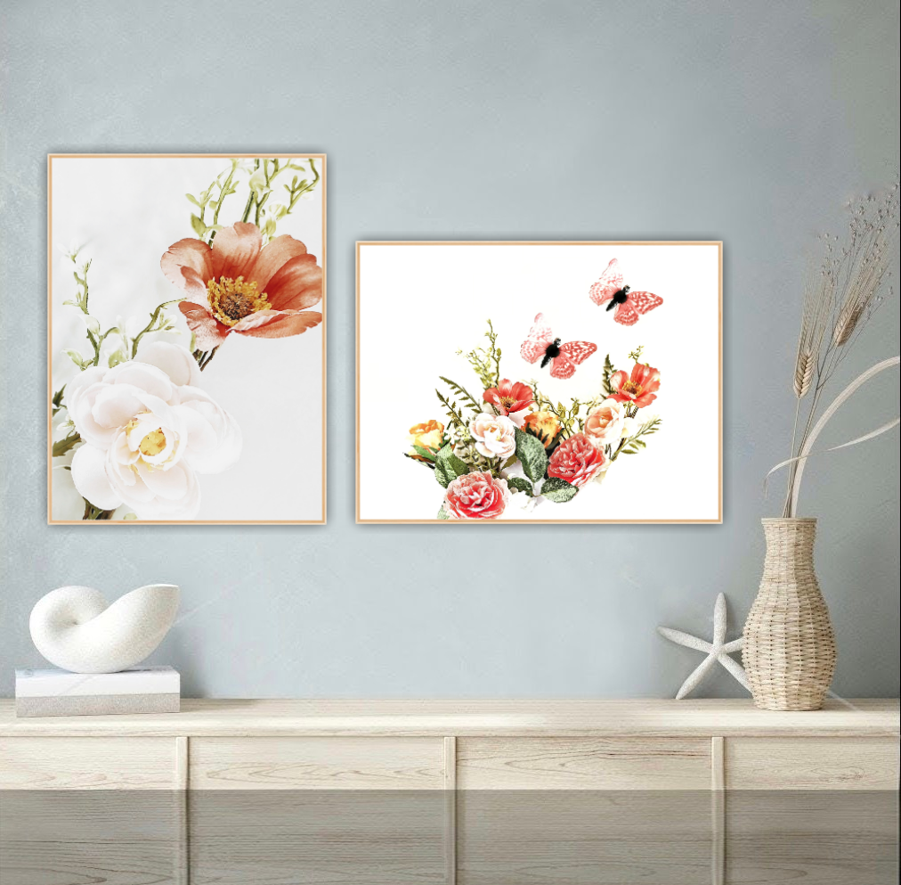 Ett botaniskt motiv av vackra stora blommor. Blir ett härligt blickfång i rummet. Botaniska motiv ger en lugn och harmonisk känsla. Kombinera den gärna tillsammans med andra botaniska motiv i samma färgtoner för en fin och inbjudande helhet. Se miljöbilder för inspiration.