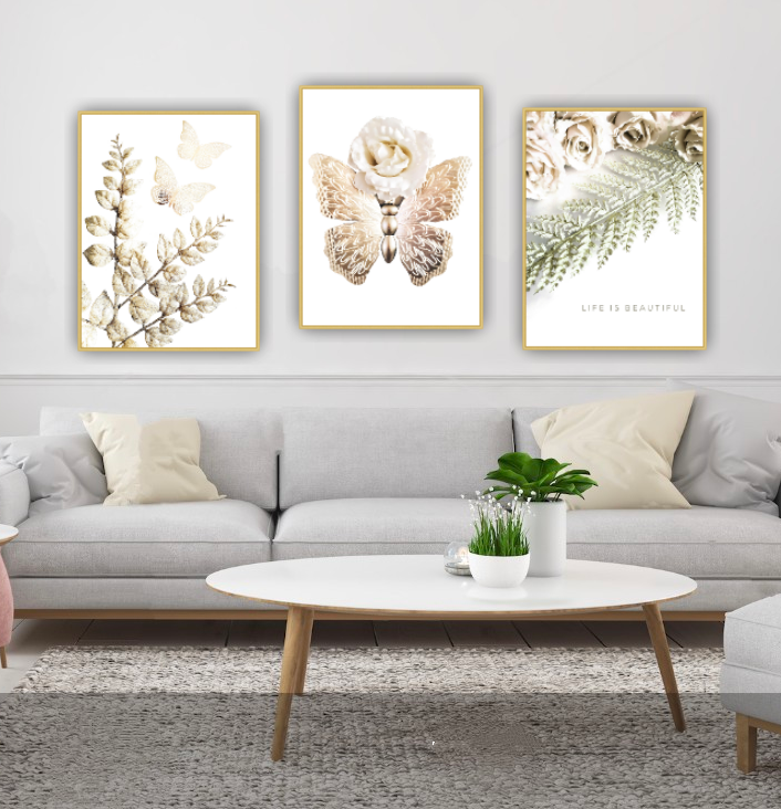 Ett färdigt posterpaket med tre matchande posters till rabatterat pris. En väldigt fin och romantisk kombination med vackra kvistar och blommor i guld med texten "Life is beautiful" tillsammans med fina fjärilar. Ger en ombonad och lugn känsla och blir ett härligt blickfång i rummet.