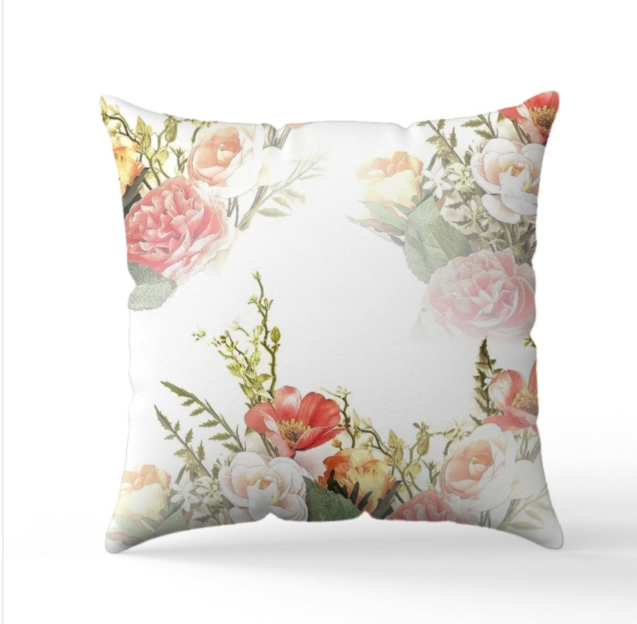 Ett fint och romantiskt kuddfodral av vackra blommor i röda toner.