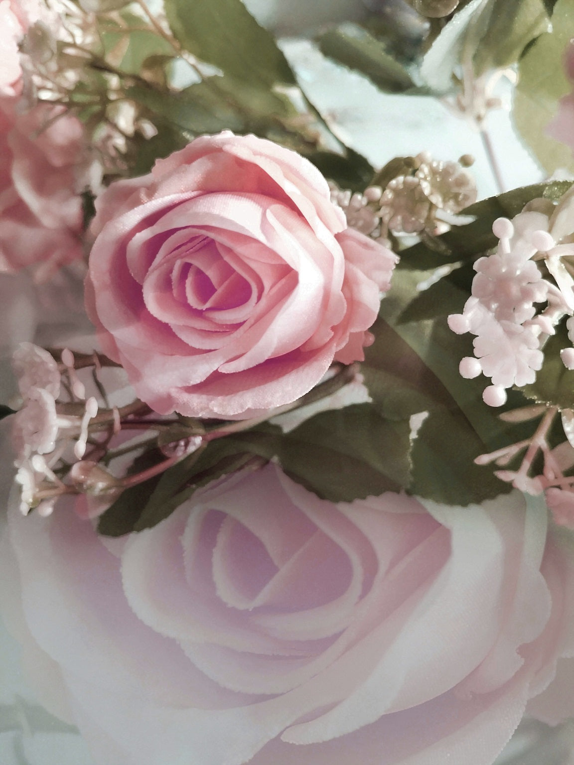 Vackert botaniskt motiv med rosor och små vita blommor. Romantiskt motiv som ger en harmonisk och ombonad känsla i rummet. Kombinera gärna med andra botaniska motiv i samma färgtoner och skapa en unik tavelvägg.